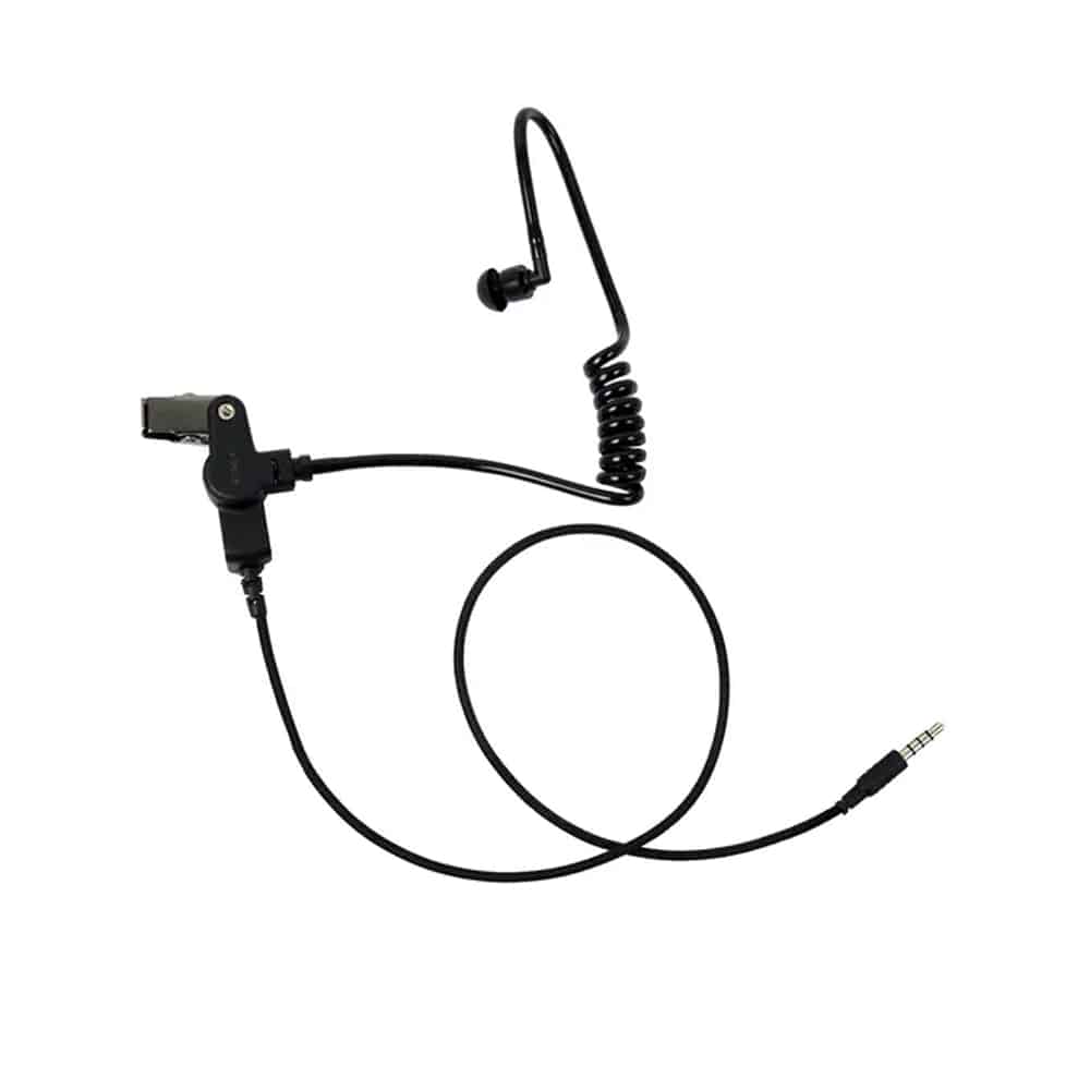 Zwart luchtslangoortje met 3,5mm jackplug aansluiting. De kabel is van stof, dit zorgt voor meer flexibiliteit en stevigheid. Het oortje biedt een krachtig en helder geluid en deze biedt meer bescherming tegen UV-straling. Universeel, 3,5mm L-vormig
